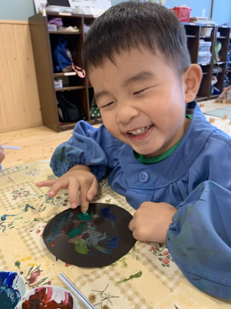 自分が吹きかけた絵の具が四方八方に広がるのを見て、嬉しそうな笑顔!