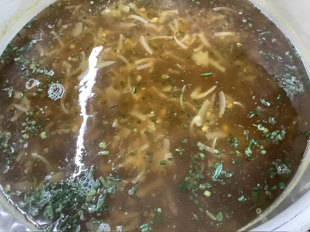 昆布とかつお節でじっくりと出汁をとり、コーンと玉ねぎを加えました。