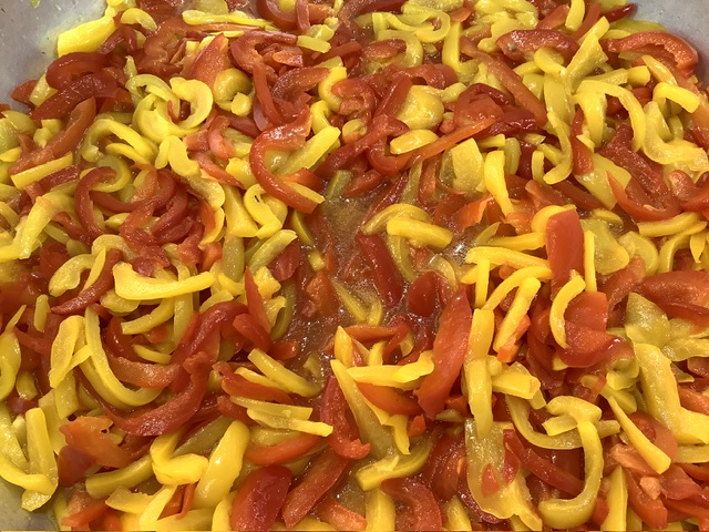 赤・黄パプリカをスチームにかけ、酢、きび糖、塩、オリーブ油を漬け込みます。