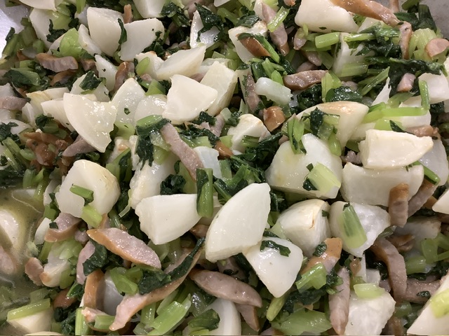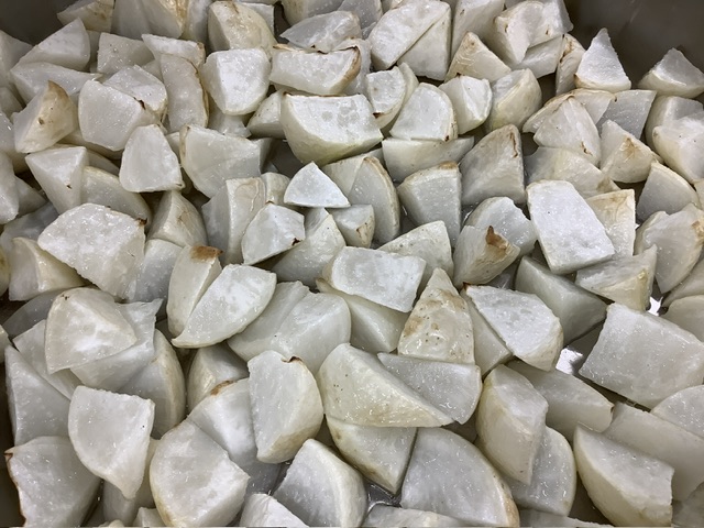 カブは全体に菜種油をまぶし、オーブンで焼き目を付けてからサラダに混ぜています。
