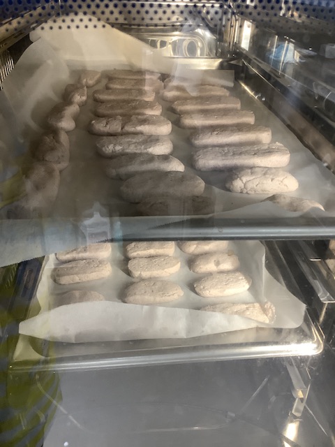 薄力粉・きび糖・紫芋パウダー・ごま・米油を混ぜ、楕円形に成形して焼き上げます。