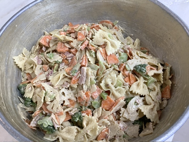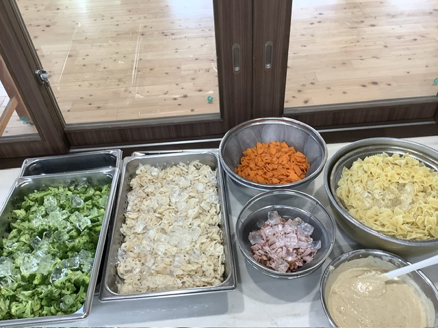 南州農場のハムと、ブロッコリー、にんじん、ちょうちょ型のショートパスタ、手作り豆乳マヨネーズで和えました。