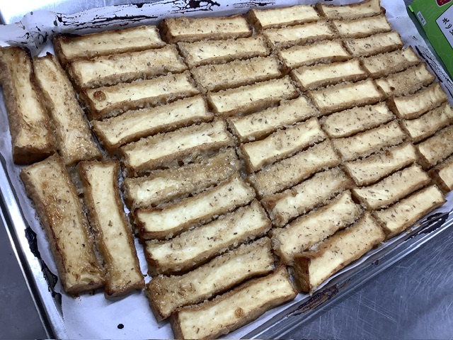 スライスした厚揚げに塗り、焼き上げました。ニンニクと味噌の香ばしい香りがいっぱいに広がり、ご飯の進む一品に仕上がりました。