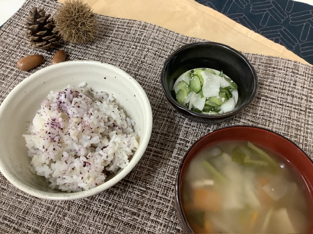 新米の五分付き米をゆかりご飯にして、塩麹漬けを添えます。