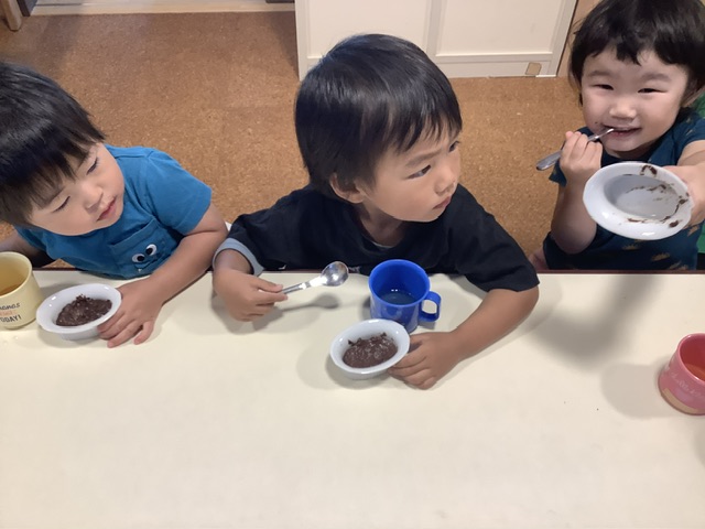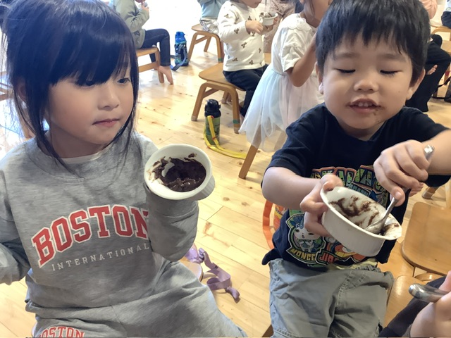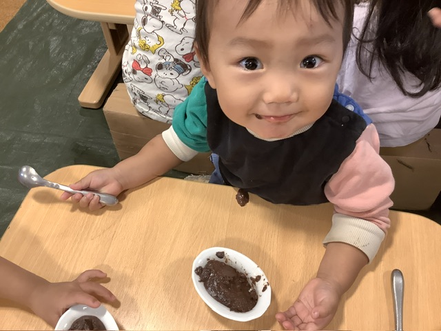 子どもたちは「チョコだ〜」「プリン〜」と、錦ヶ丘ではなかなか提供がない『チョコ』のお菓子が出てきたと思った子どもが多く、嬉しそうに食べてくれました。