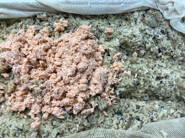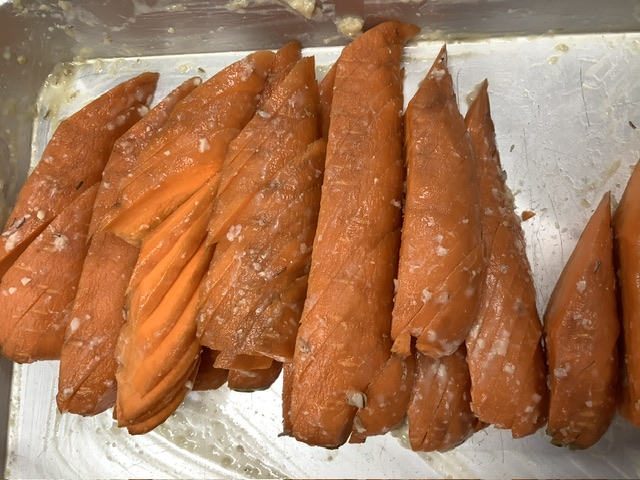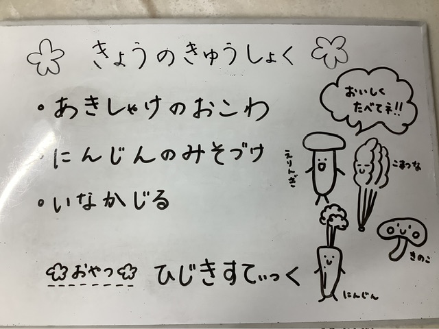 鮭の皮は小さく切り、再度焼きました。パリッとなった皮は、食べる手が止まらなくなるほど美味しい〜😋給食チームは、食材を余すことなく、なんでも工夫して作っちゃいます!!