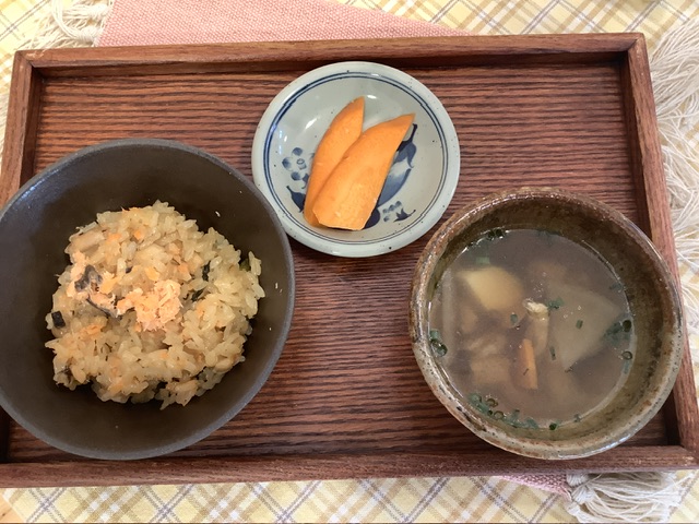 かつお節、昆布で出汁をとり、大根、人参、里芋、蒸し煮したごぼう、薄揚げ、小ネギ、一真の鶏肉が入りました。野菜たっぷり、鶏肉の旨みも入り、美味しい田舎汁の出来上がりです。