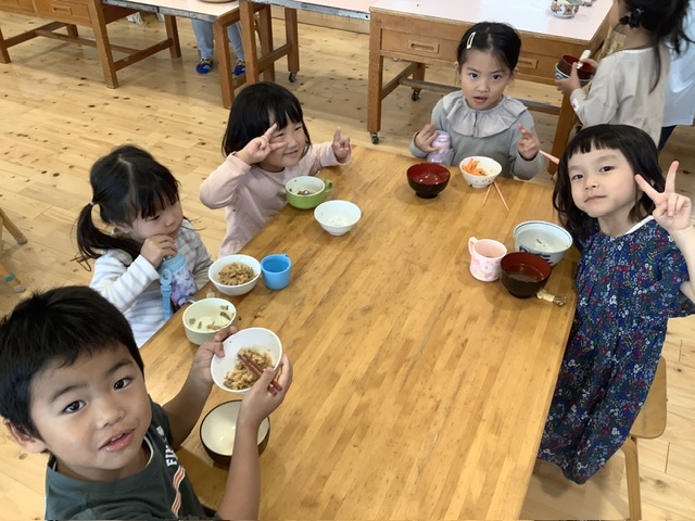 今日ランチルームでは、さくら組、もも組、きく組の子ども達が、好きなテーブルで食べていました。きく組の子どもたちは、上のクラスの子と普段別々に食べているので、とても嬉しそうに食べていましたよ♪