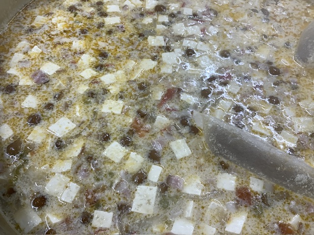 かつお節からじっくりと取った出汁で、玉ねぎ・トマト・いんげん・なめこ・木綿豆腐・南州農場のベーコンを煮込んでいきます。