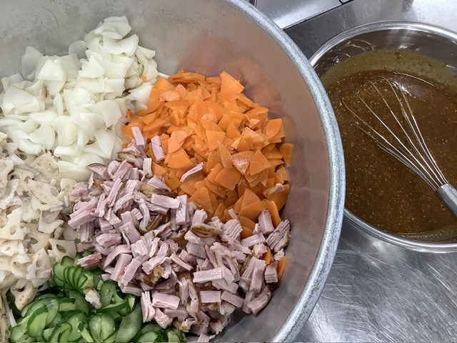 れんこん・かぶ・きゅうり・にんじんのたくさんの野菜と、南州農場のハムをスチームにかけて加熱をしました。彩りも鮮やかで、シャキシャキの食感も楽しめる組み合わせです!