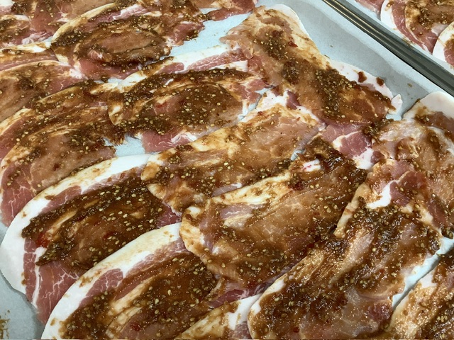 一真から届いた豚肉に、梅干しを細かく刻んだもの、味噌、きび糖を混ぜ合わせたものを塗り、焼き上げます。