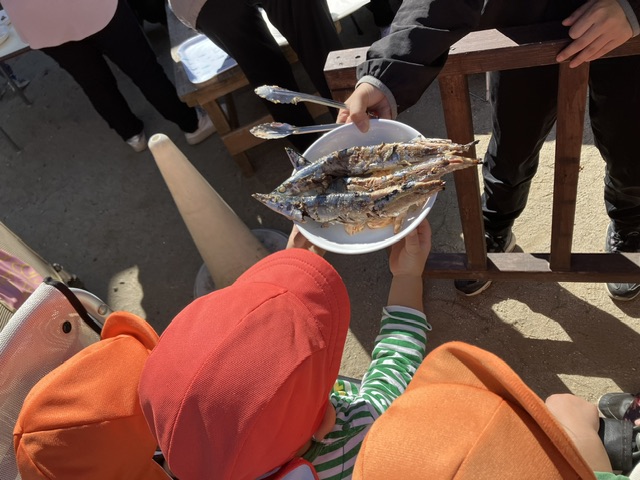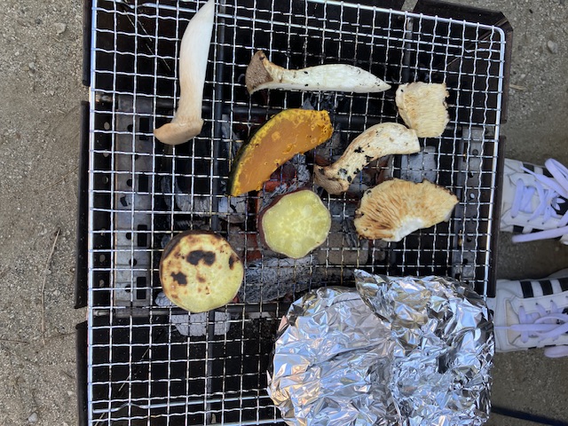 1日目となる今日は、園庭で網とたき火を使って秋が旬の食材を焼いてみんなで食べました。
