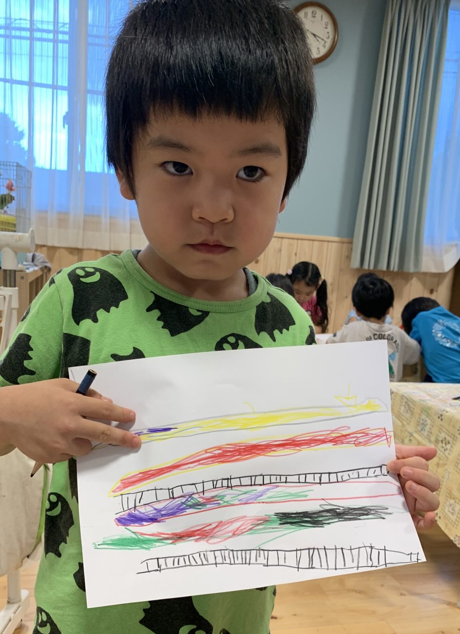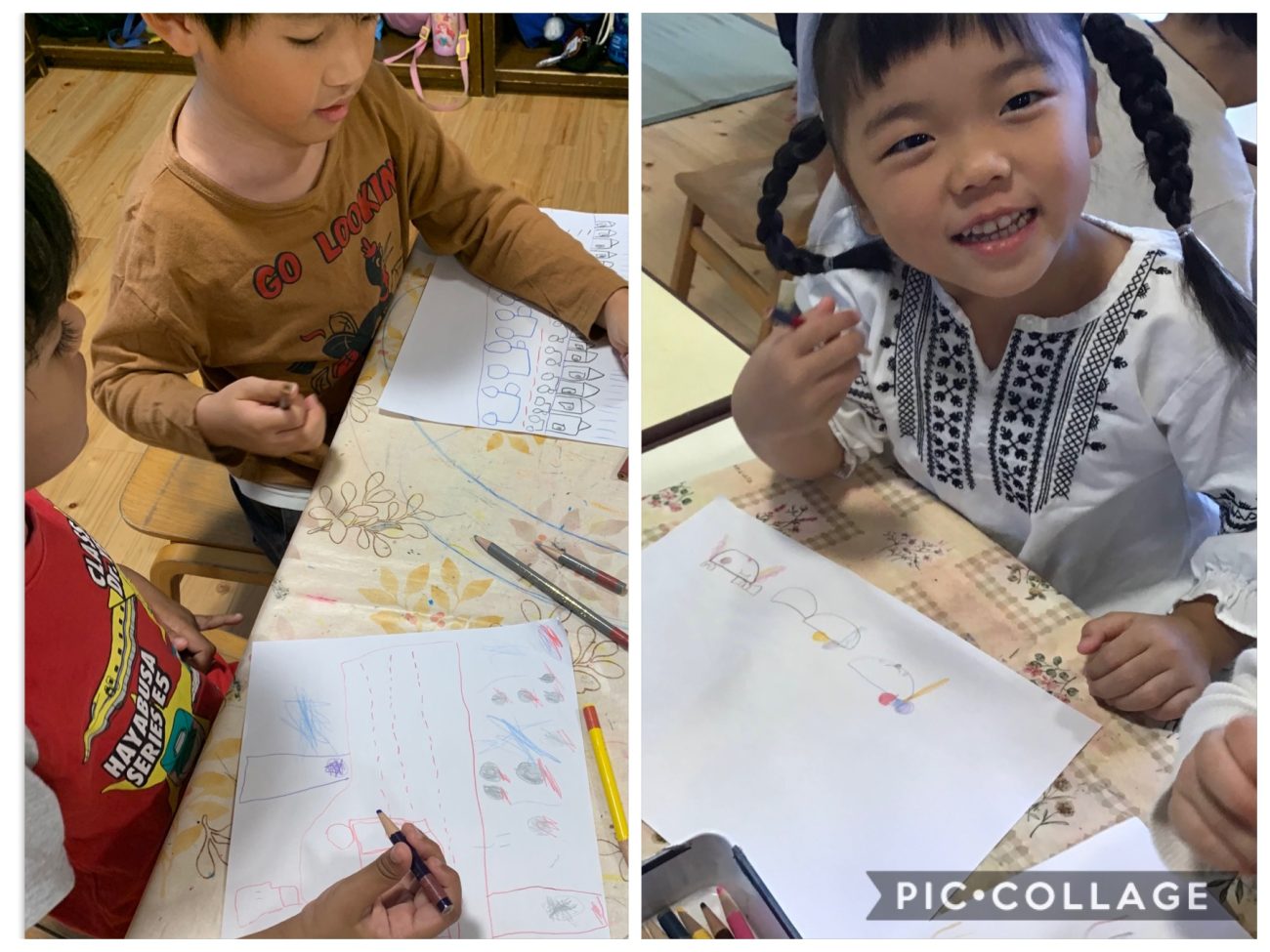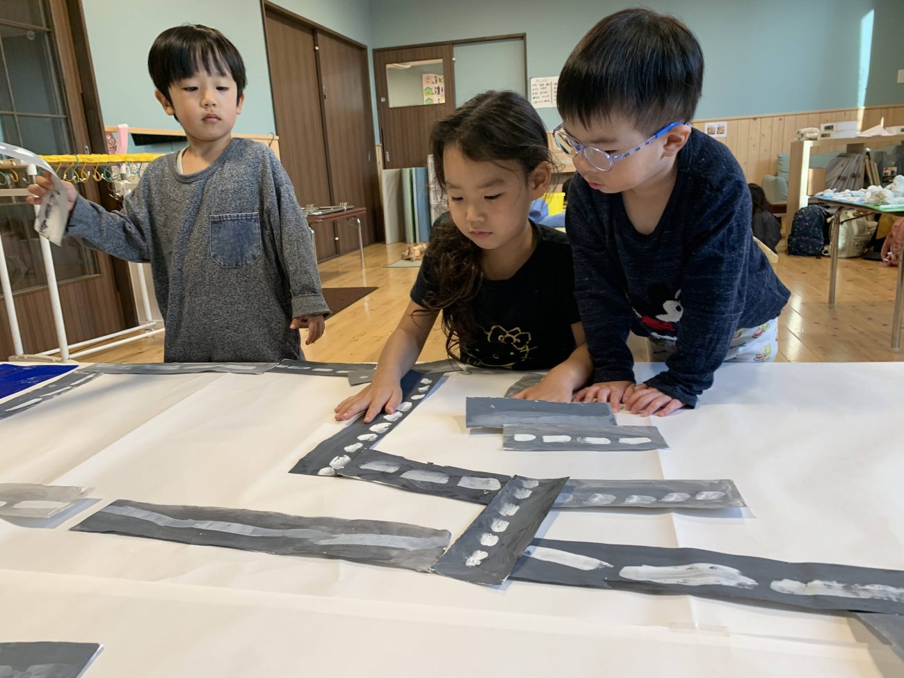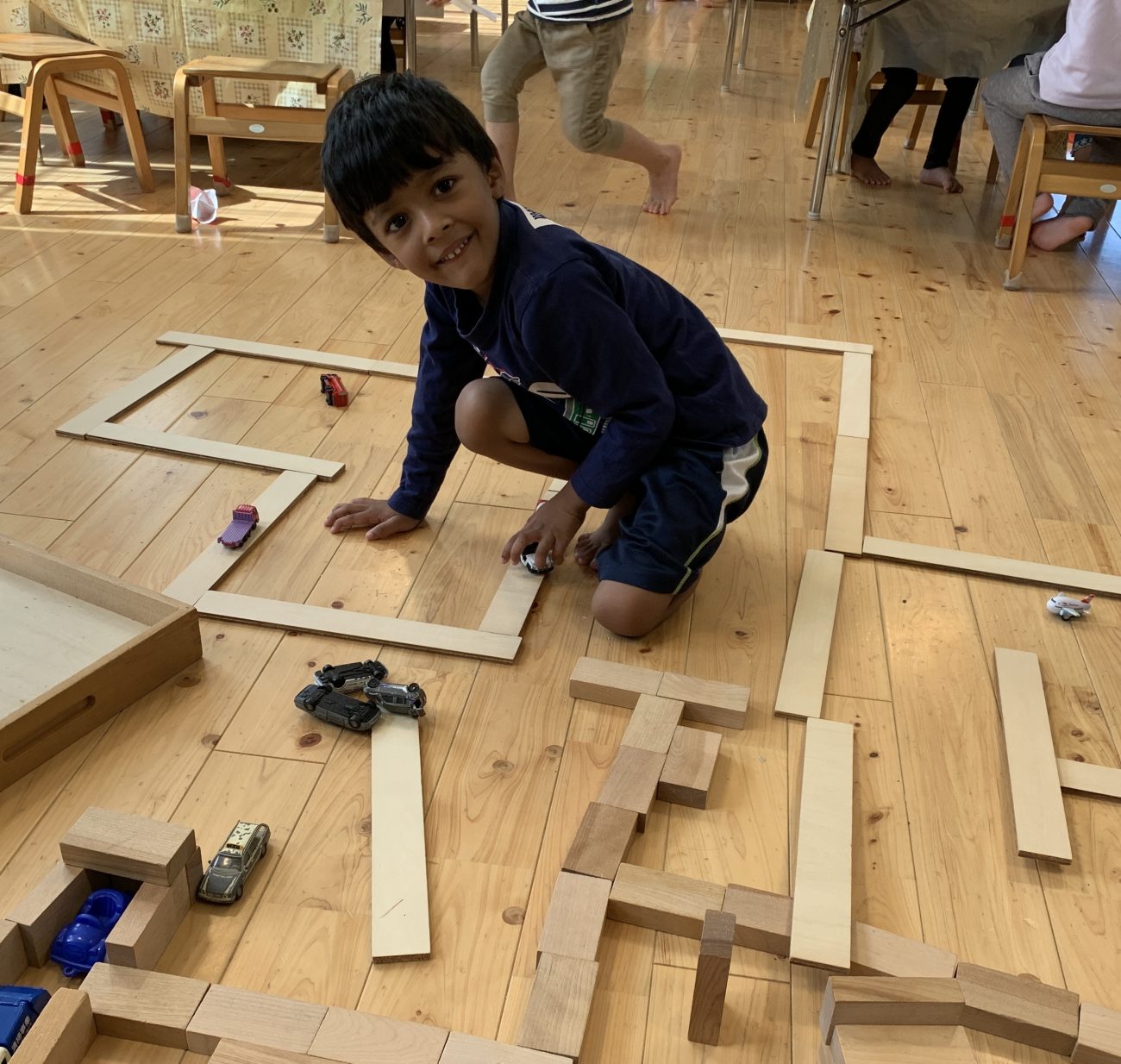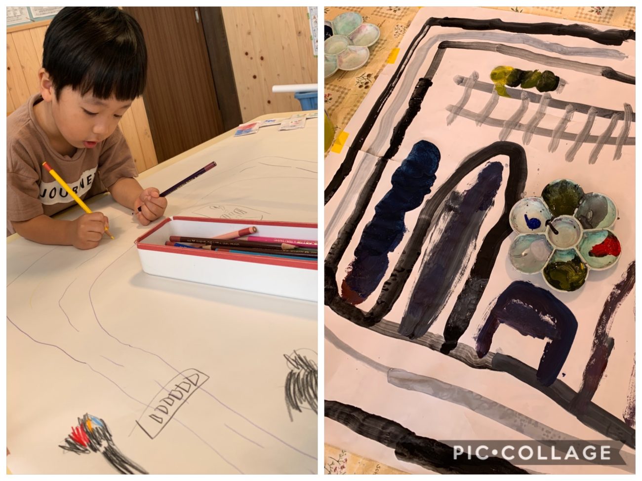 普段の自由遊びから、童具やお絵描きで建物や道路をつくって遊んで