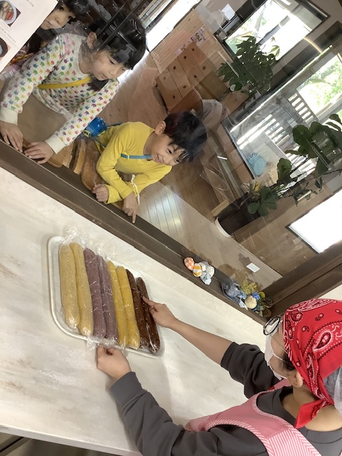 給食室を覗きに来てくれた子どもたちは「これ何〜?」と色鮮やかな生地が気になる様子でした