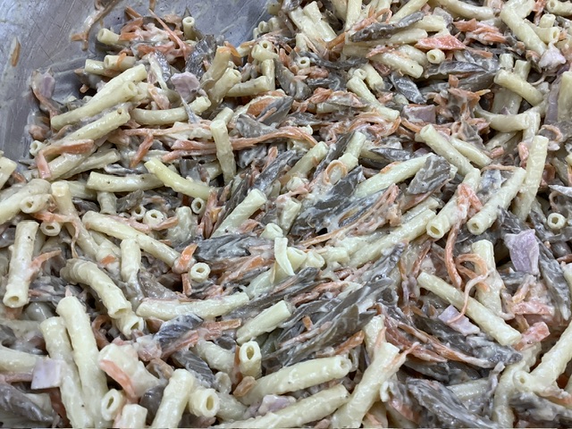 にんじん・マカロニ・南州農場のハムと一緒に、すりごまを混ぜた豆乳マヨネーズで和えました。