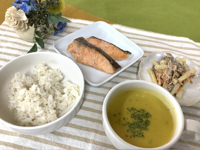 脂が乗った鮭に塩こしょうで下味をつけて小麦粉をまぶし、バターを乗せてオーブンで焼き上げました。身が柔らかく食べやすい鮭は子どもたちにも特に人気があります。