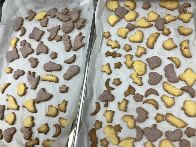 今日のおやつはハロウィンクッキーでした。ハロウィンらしく、プレーン・ココア・紫・黄色の4種類のクッキーを作りました。生地は、紫芋やかぼちゃのパウダーで色を付けています。