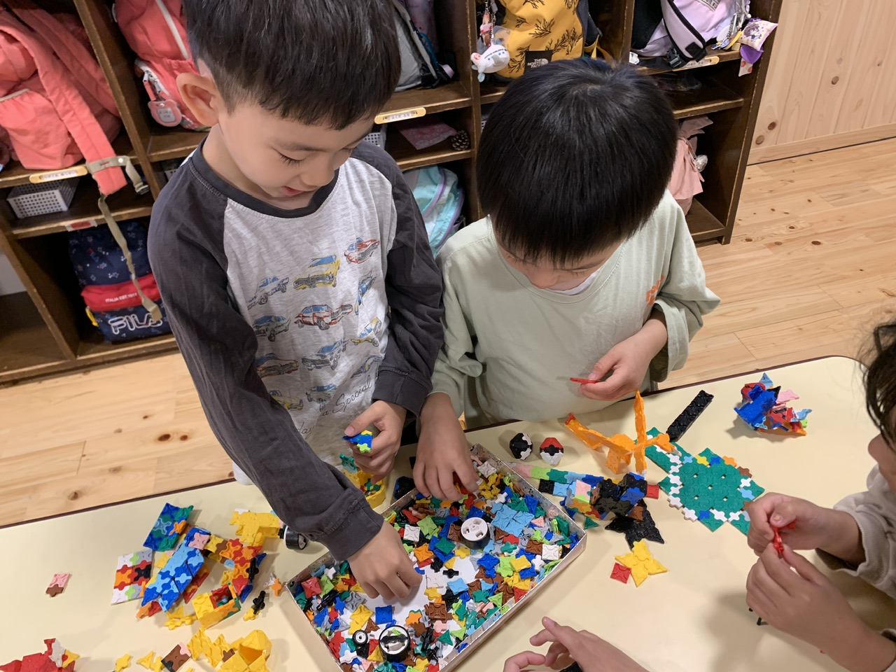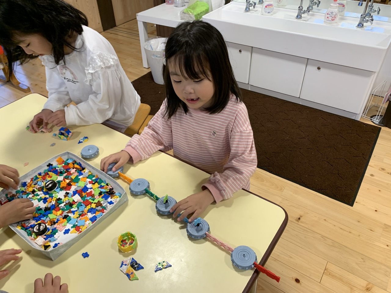 午後の自由遊びの中で、ラキューを使う機会が多くありました。指先を使って工夫しながら遊ぶ姿が見られています。最初は、四角や丸など同じものを作る子が多かったのですが、回数を重ねるごとに作ってみたい物をイメージしながら挑戦する姿が増えてきていました。