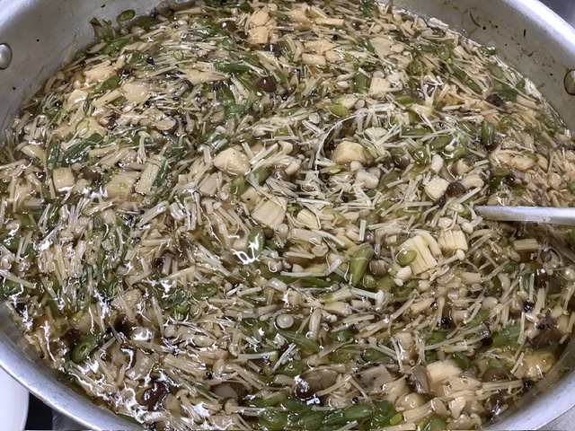昆布とかつお節でとった出汁できのこあんを作ります。
