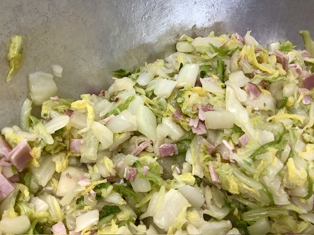 ざく切りにした白菜をスチームで加熱し、軽く水気を絞ってから南州農場のハムと和えています。