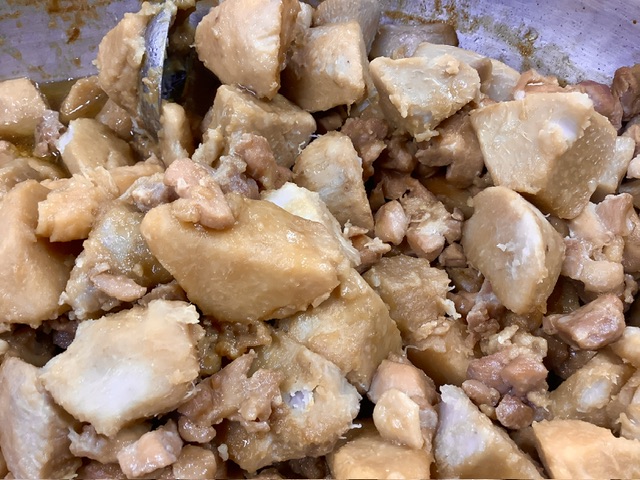 今日は、里芋を鶏肉と一緒に煮物にしました。鶏肉に軽く焼き目を付けてから里芋と合わせ、きび糖・濃口醤油・酒・みりんを混ぜた調味料で落とし蓋をして煮込んでいます。