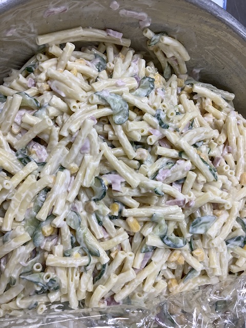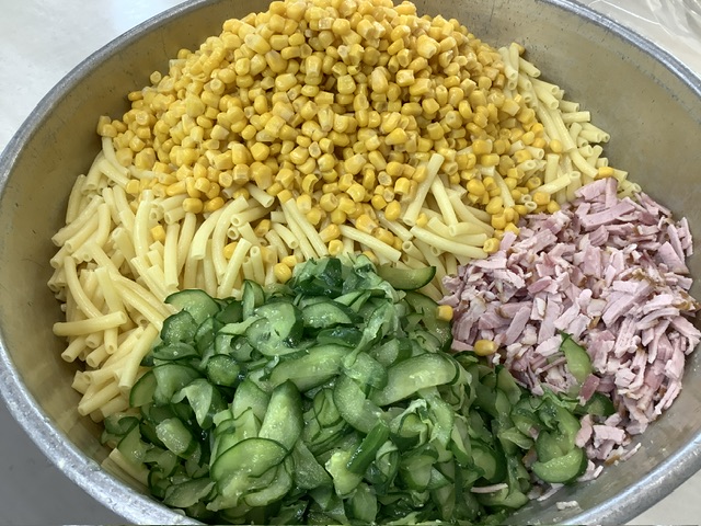 マカロニサラダは、きゅうり、南州農場のハム、コーン、豆乳マヨネーズが入りました。