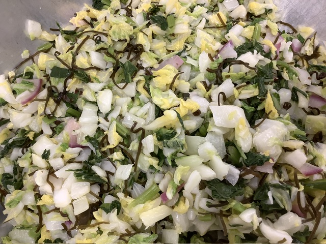 白菜、カブの葉、赤かぶをそれぞれスチームにかけて、塩昆布、ごま油で和えました。