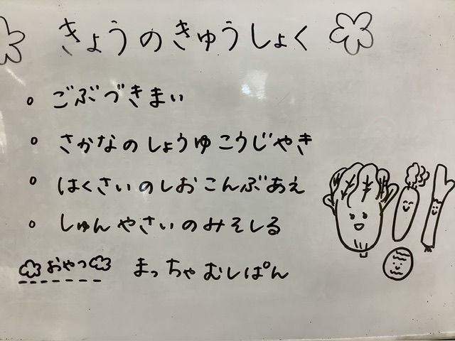 この塩昆布和えは、子どもたちがよく食べてくれるメニューの一つです。今回は、カブの葉も小さく刻み入れてみたところ残食なしで返ってきました。醤油麹焼きがしっかりした味付けだったので、さっぱりと頂ける野菜が進んだようです。