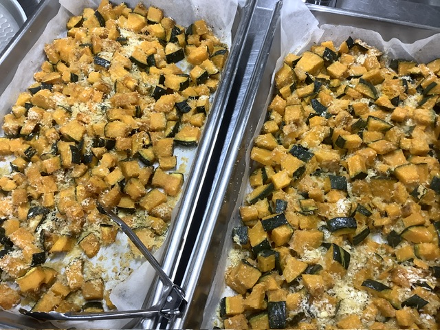 塩こしょうで下味を付けたかぼちゃに、粉チーズを混ぜたパン粉をまぶして、オリーブオイルをかけてオーブンで焼き上げました。じっくりと加熱することで、かぼちゃが柔らかくほくほくとした食感になります。香ばしいパン粉とチーズが、子どもたちにも大好評でした!