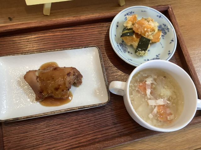 大丸鰹節店のだしパックで出汁を取り、じゃがいも・キャベツ・35ファームのにんじん・南州農場のベーコンを煮込みました。手作りの玉ねぎ麹と薄口醤油・洋風だしで味付けをしています。