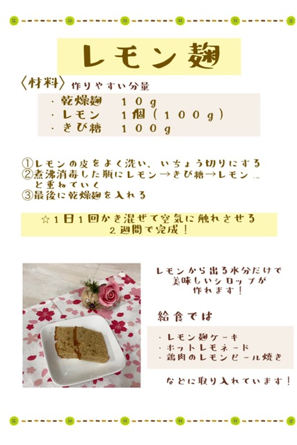 レモンと乾燥麹ときび糖を混ぜるだけで簡単に作れるレモン麹、ぜひご家庭でもお試しください♪