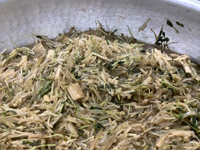 豆苗・えのきたけ・もやしをごま油で炒め、オイスターソース・濃口醤油・きび糖・酒・みりんで味を調えました。野菜から出る水分も無駄にすることなく、調味料と一緒に炒めることで、とろみのある仕上がりになりました。