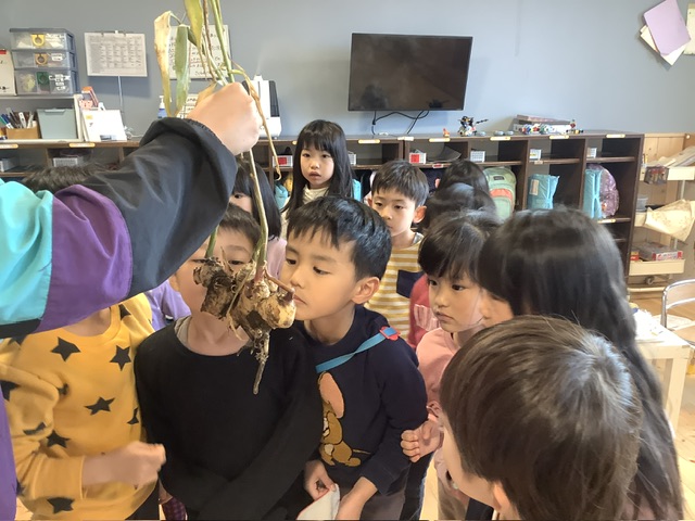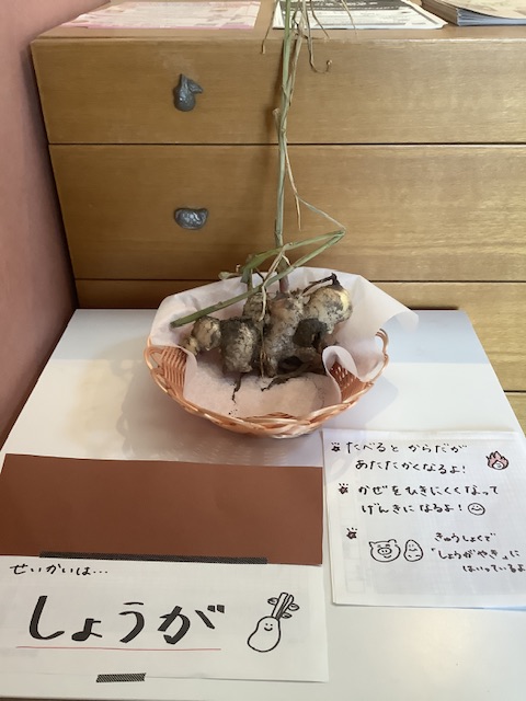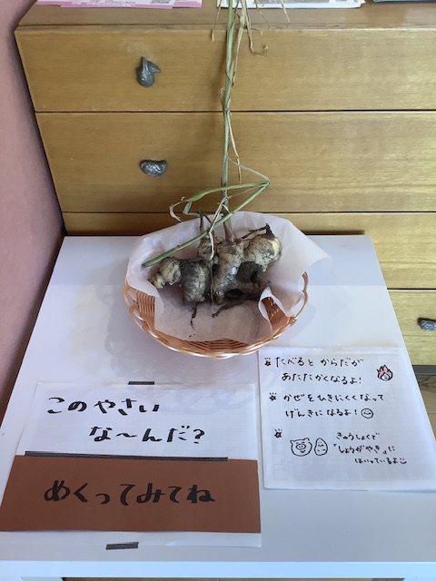 もも組では、「これ知ってるよ!」と教えてくれたり、おそるおそる生姜に触ってみたりとさまざまなリアクションの子どもたちでした。