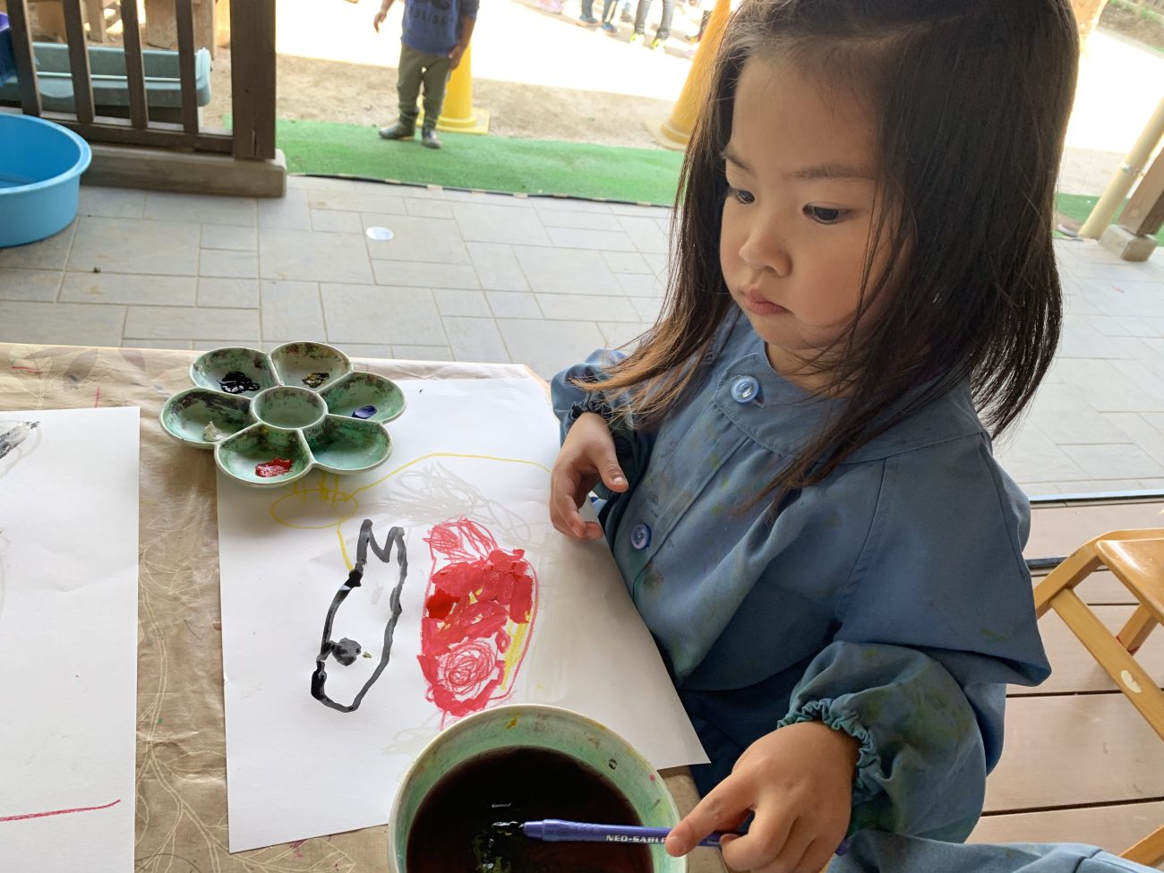 との気づきから、薄く・濃く描けるよう水と絵の具の量の調節をする等工夫をしたり、花瓶に水が入っている事にも気づき表現したりと様々な姿がありました。