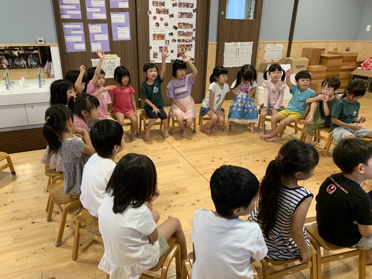 子どもが言いたいことを言えて、聞きたいことを聞けるようになるには、大人も子どもも「練習」が必要です。錦ヶ丘では、「サークルタイム」という時間を設けています。友達全員の顔が見えるよう円状になって座り、みんなで遊びの内容を決めたり、何か困りごとが起こった時に自由に意見を言い合ってその解決方法を考えたりしています。中にはみんなの前で言うのは恥ずかしいと萎縮する子もいますが、回数を重ねるうちに堂々と自分の意見を伝えることが出来るようになっています。そして自分の意見が尊重されることが自信に繋がり、より意欲が高まっているようです。練習を重ねて自分の意見が言えるようになっていく子どもを見ていると、大人にも練習が必要だと改めて感じる日々です。