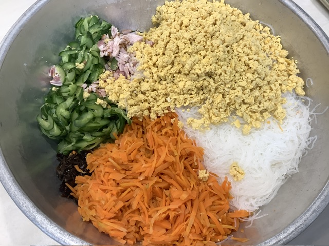 春雨・炒り卵・南州農場のハム・きゅうり・にんじん・きくらげを甘酢で和えました。