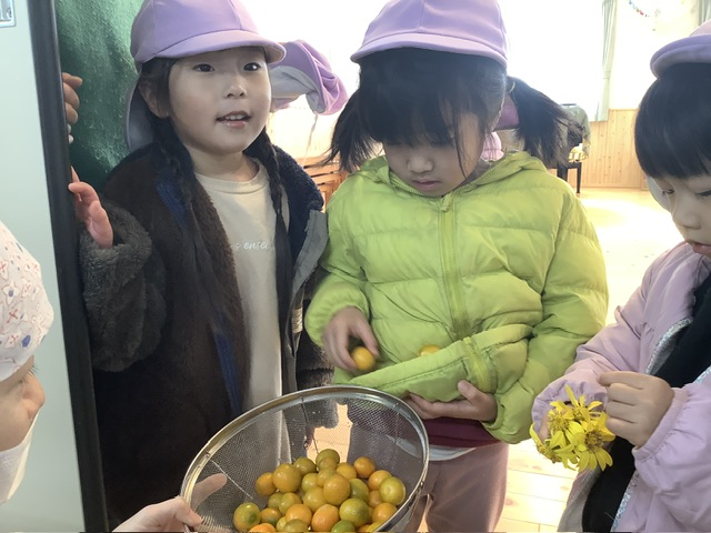 「金柑どんな味がする?」と聞いてみると、「すっぱかった〜」「ちょっと苦手だった」「ジャムみたい!」「みかん?」といろんな声が聞こえました。