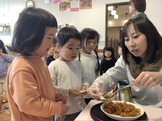 今日はこの金柑をきび糖で甘煮にして、きく組の子どもたちにも提供しました。