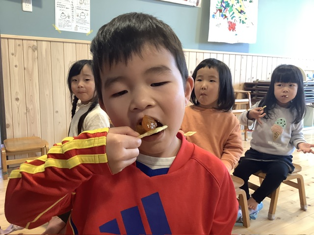 おやつの時間の子どもたちの様子を見に行くと、金柑をクラッカーに乗せて食べていました。