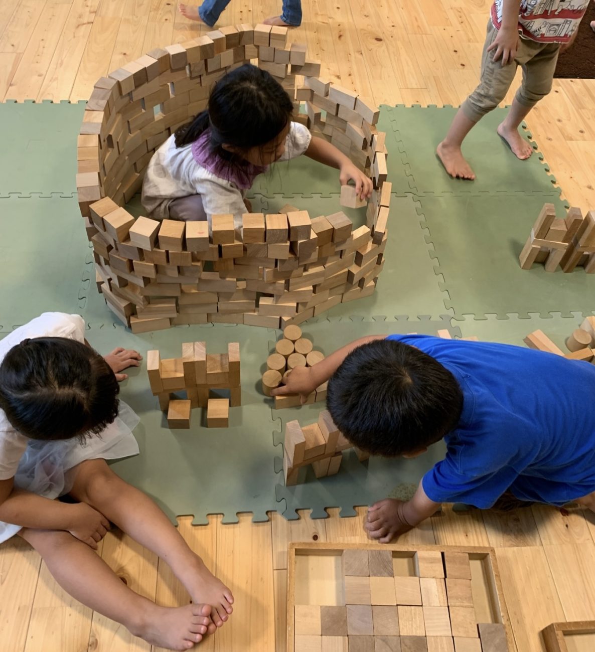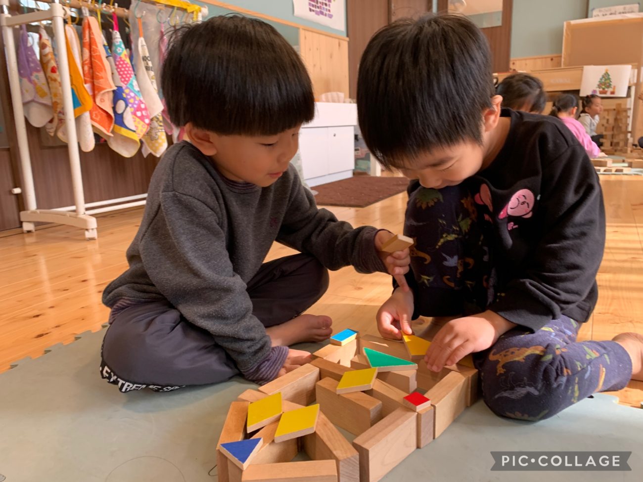 季節によっても描く対象が変わり、見守っている大人も楽しむことができます。これほど表現豊かな子ども達なので、様々な表現方法を伝えたいと思いました。今回は、錦ヶ丘の三本柱にもなっている【童具】を使って各テーマに沿って表現した様子をお伝えしようと思います。