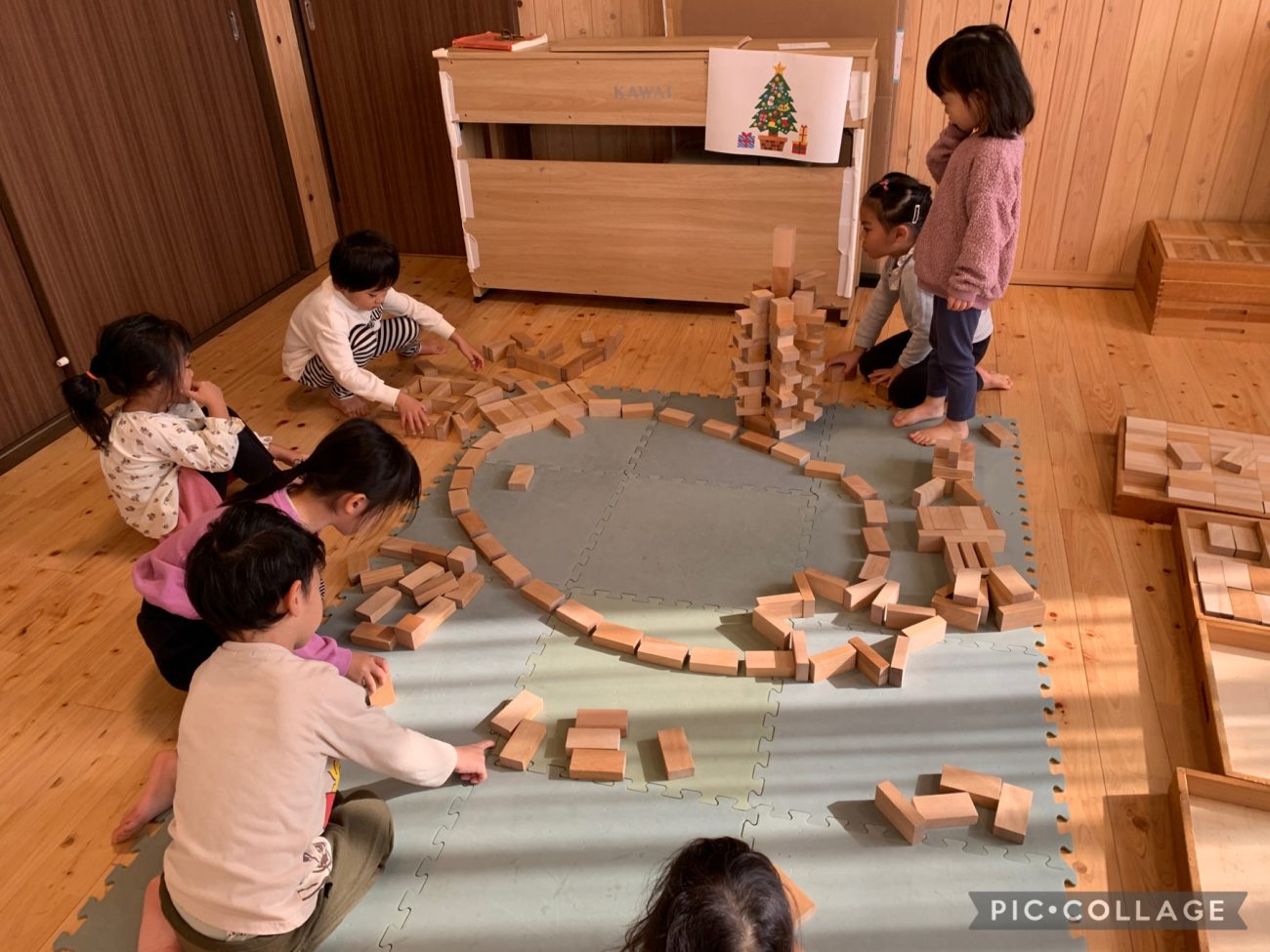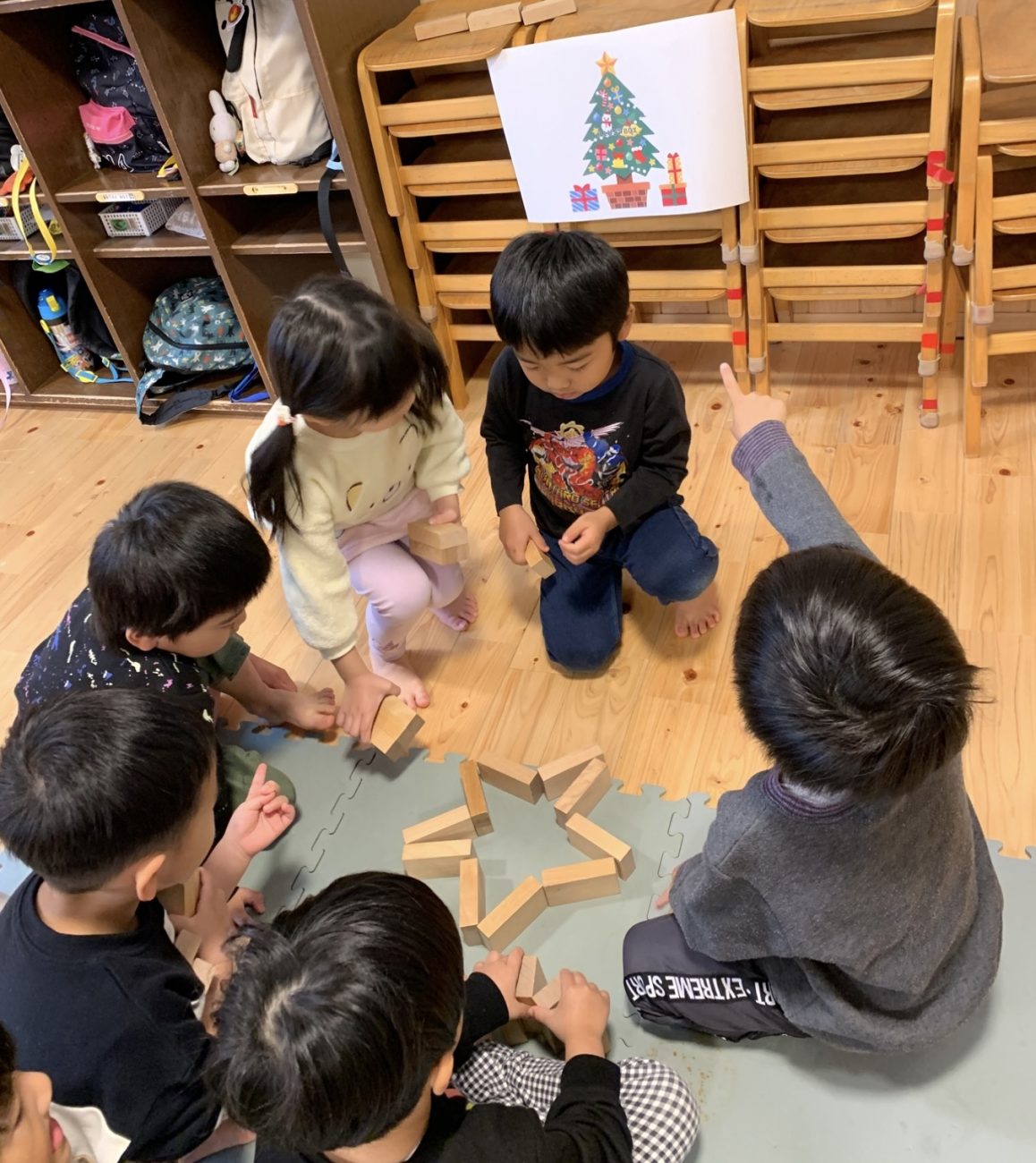 クリスマスツリーを表現しました。本物のツリーも近くにあり、イメージが湧きやすい環境でした。話し合い、役割分担もスムーズ。オリジナルの要素も入れたい子どもが「ここに〇〇作りたいんだけど、いい?」という提案をしていました。