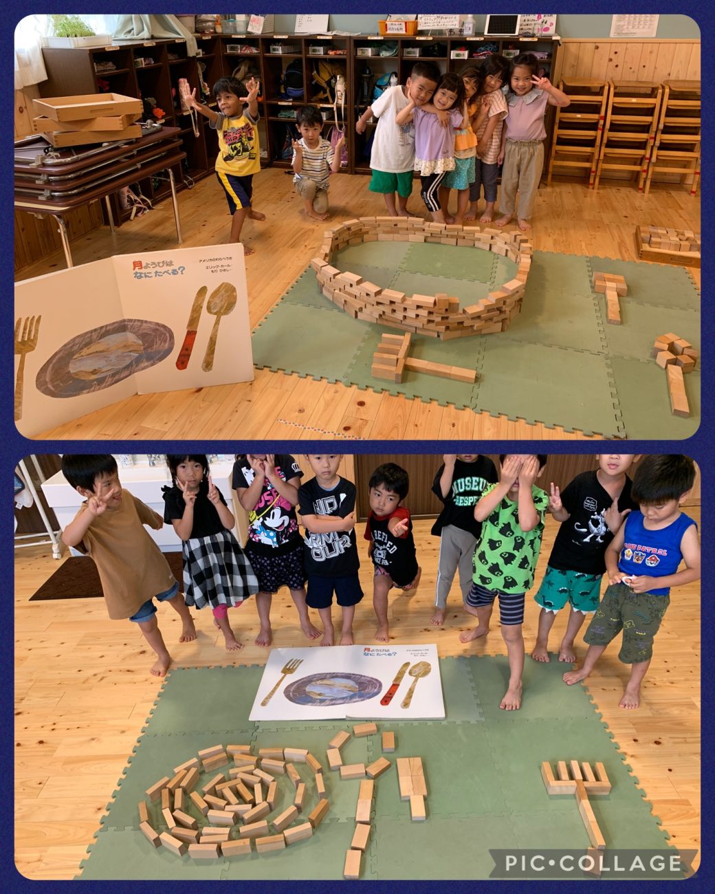 「月曜日なにたべた?」という大型絵本の中から、形を模倣しやすいページを選んで取り組みました。少人数とはいえ、相手の意見と自分の意見に折り合いをつけることが難しい様子でした。一人ひとりのが好きなものを作ってしまい、一つにまとまるまでに時間を要していました。そこで大人が仲介役となり、より良い方向へ導くサポートしました。大人の姿をみて話し合いのやり方を学び、少しずつ自分たちで取り組めるようになっていきました。