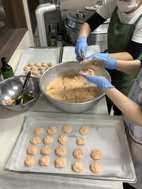 白玉粉をフードカッターにかけて細かくし、トマトジュース・卵・粉チーズ・南州農場のベーコン・オリーブオイルを混ぜて作った生地を丸く成形してオーブンでこんがりと焼き上げました。