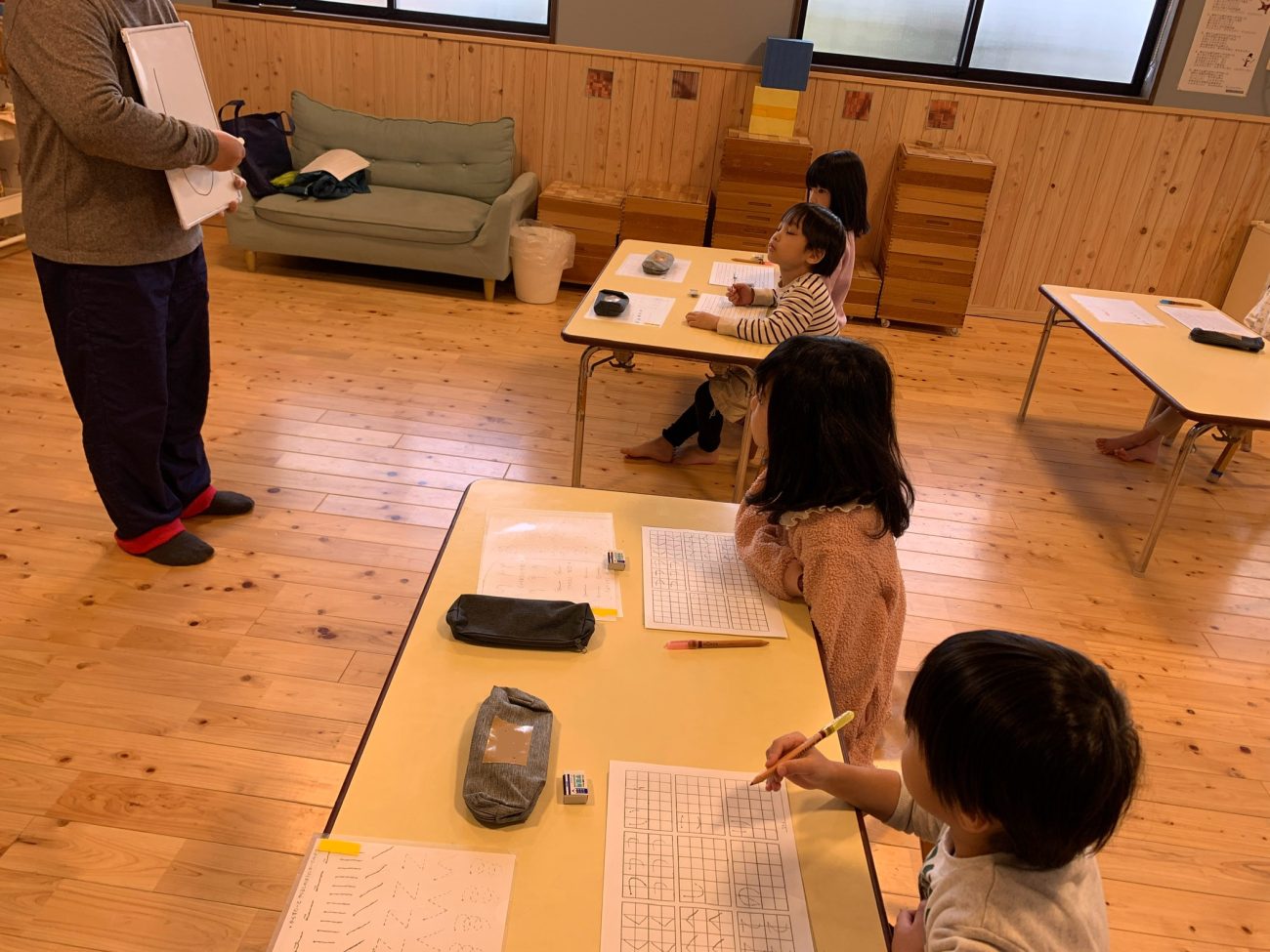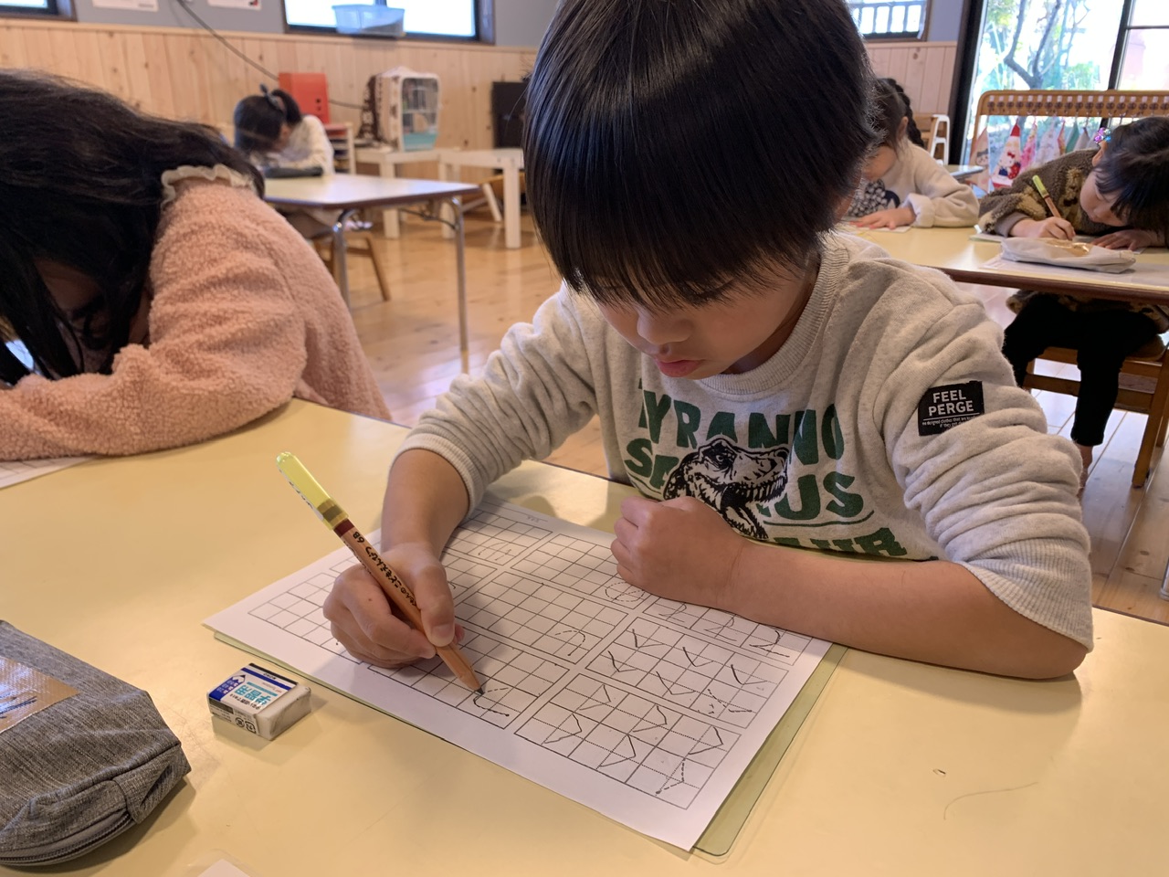 しっかりと学んだことを意識しながらプリントに取り組み、時には隣の友達と確認し合いながら進めていました。文字にあまり興味のなかった子達も基礎から知る事で、苦手意識を持つ事なく「やってみよう!」と思えるようになってきているようです。また、硬筆を通して文字の読み書きへの興味関心が高まっています。