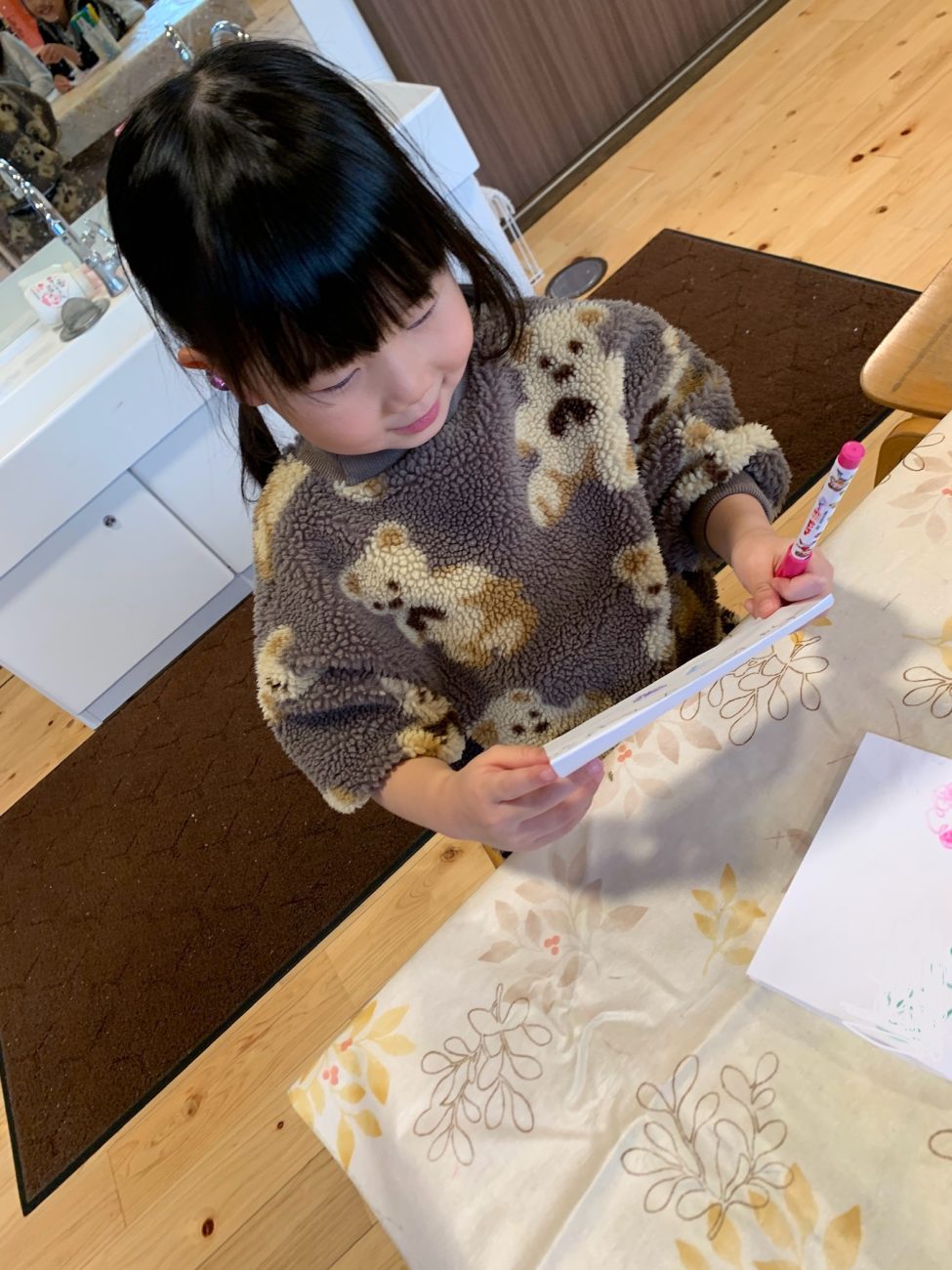 もちろん、想いを手紙で伝えるには、文字を書かないといけないという点もあります。経験や想像などから書きたいことを見つけ、伝えたいことを明確にする力も必要となっていきます。文字を書く事に興味があまりない子は何をどう書けばいいか分からず、最初は戸惑い、難しいと感じることもあると思います。その中で、友達が書いている姿やあいうえお表を見ながら書く経験を通して文字に触れる楽しさに気付き、次第に文字や文を書けるようになっていければと思っています。今後も、文字への興味が深まるよう、保育室に【あいうえお表】や大人から子ども達への手紙などを貼っていきたいと思います。文責:池田