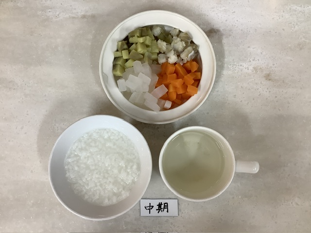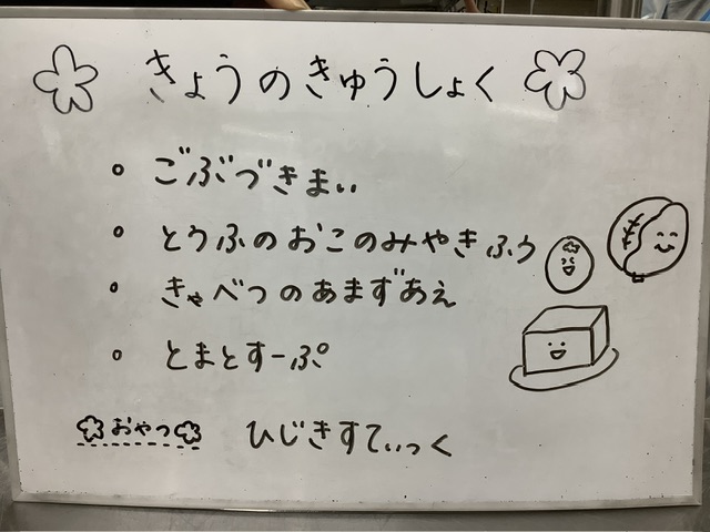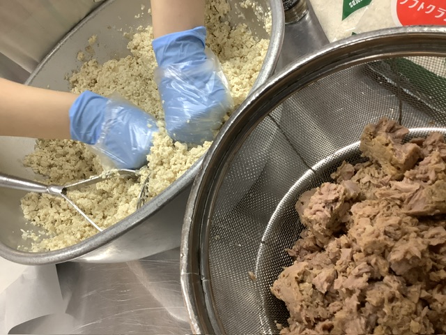 キャベツと人参はスチームをかけて、しょうゆ、酢、砂糖などで甘酢を作り、和えました。爽やかな酸味で食べやすく、子どもたちもお代わりしに来ましたよ。