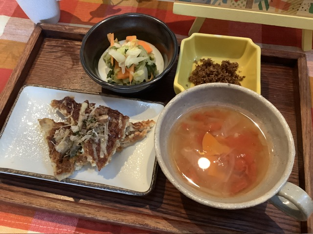 かつお節でとった出汁に玉ねぎ、人参、コーン、トマト缶を入れ、手作りの玉ねぎ麹で味を整えました。トマトの酸味と玉ねぎ麹の優しい旨みが合わさって、身体が温まるスープになりました。