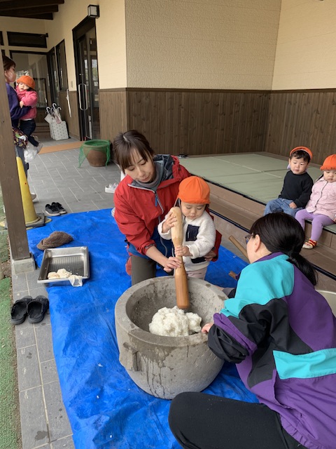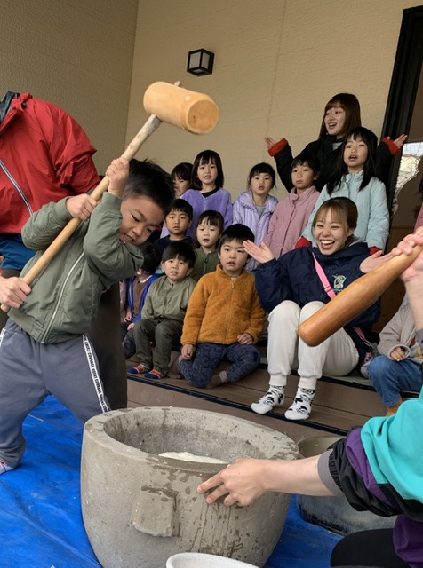 重たい杵を持ち上げて餅つきをしている様子に子どもたちも「がんばれー!」と応援をしていました!
