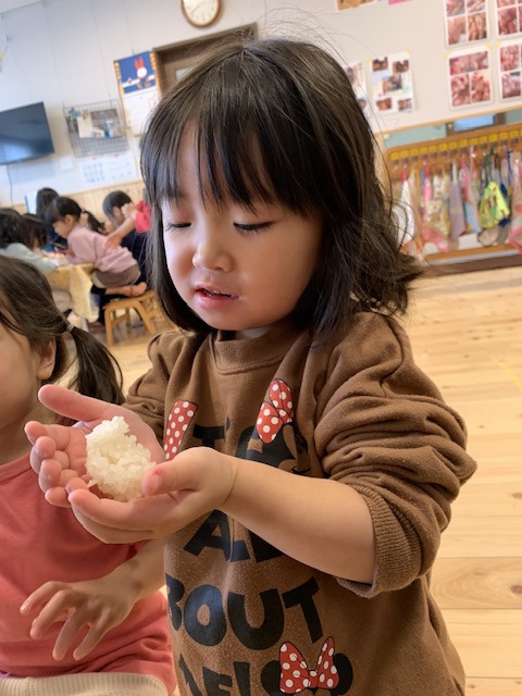 普段食べている五分づき米にもち米を混ぜて炊いて、もち米にぎりを作りました。