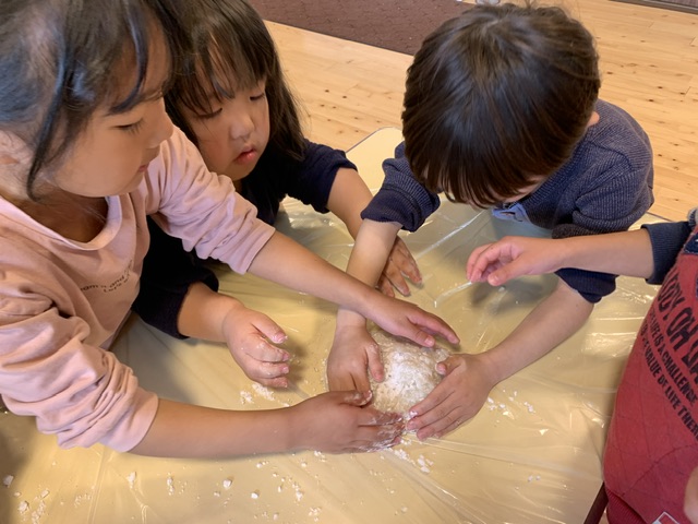 自分達でついたお餅で、さくら組の子どもたちが鏡餅を作りました。